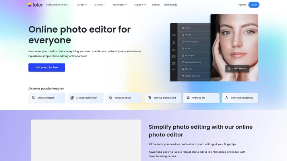 Fotor is an all-in-one online photo editing suite designed for both amateur and professional users. It leverages AI technology to simplify complex editing tasks and enhance image quality with features like: